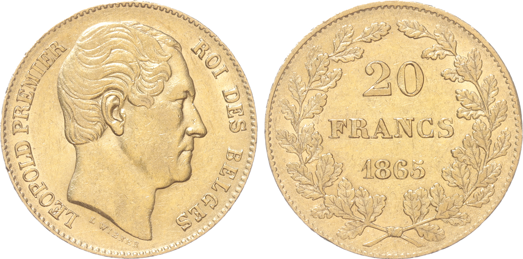 Belgium. 20 Francs gold 1865 pos. b. XF.