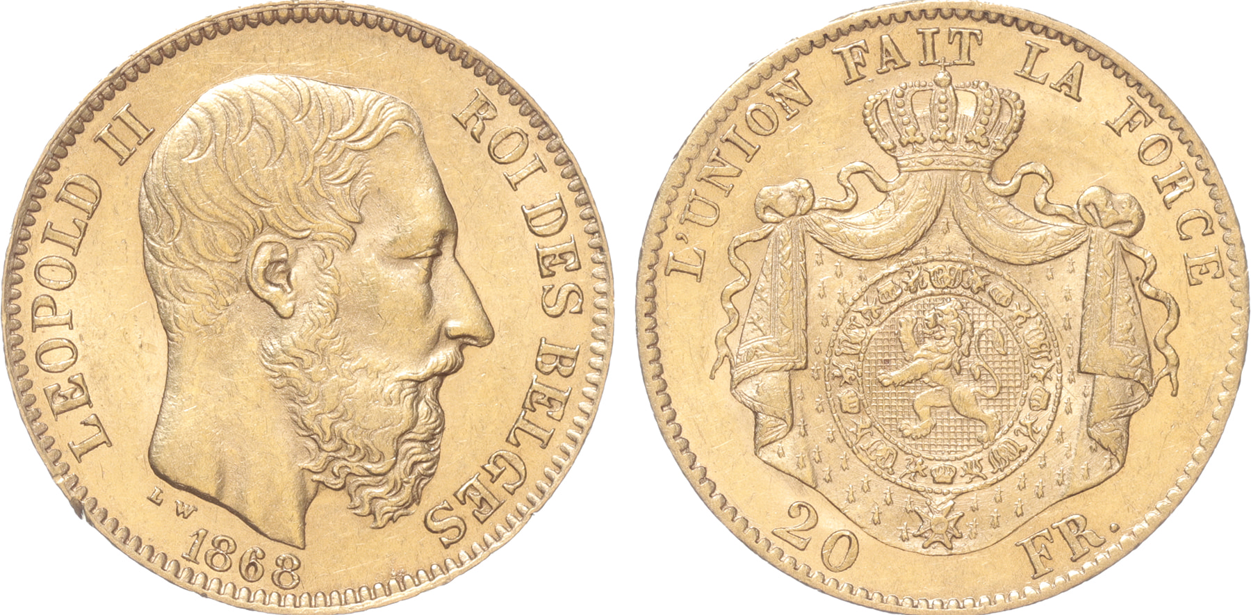 Belgium. 20 Francs gold 1868. Type I. UNC.