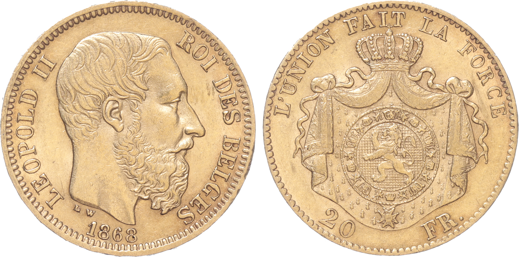 Belgium. 20 Francs gold 1868. Type II. XF.