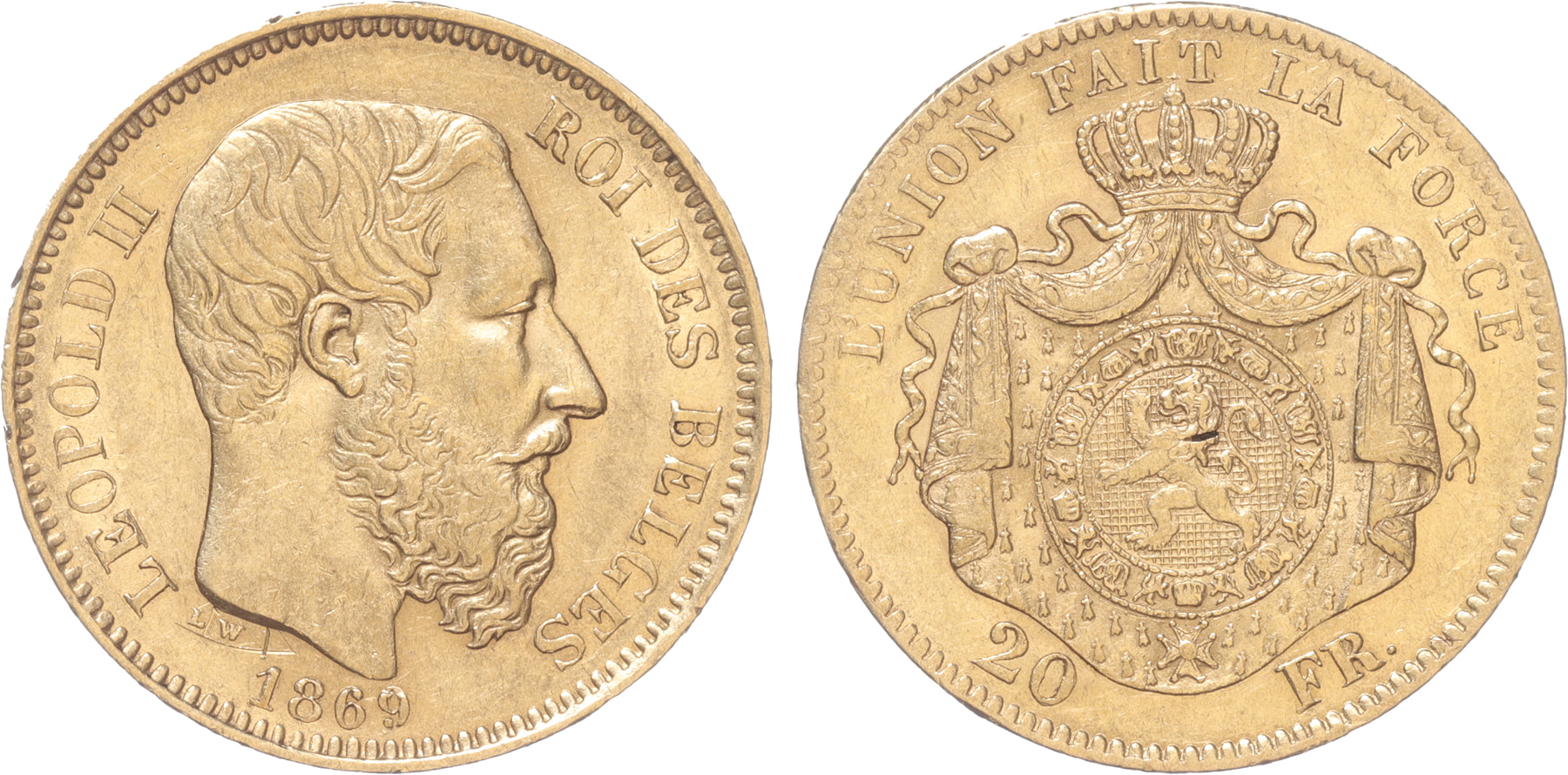 Belgium. 20 Francs gold 1869. Type II. pos. a. XF.