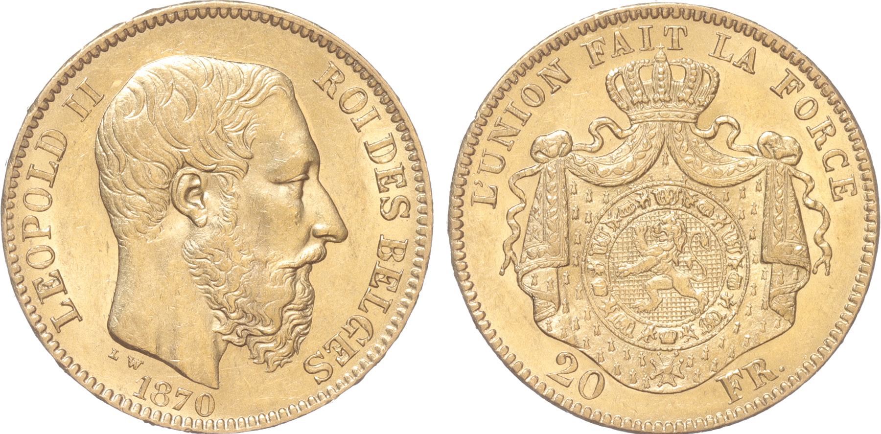 Belgium. 20 Francs gold 1870. Type I. XF.