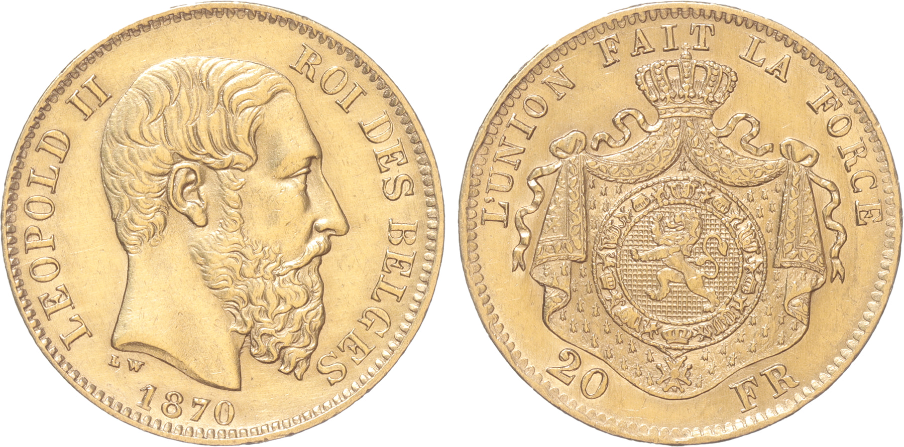 Belgium. 20 Francs gold 1870. Type IV. XF.