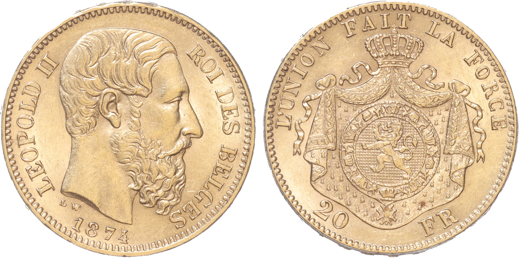 Belgium. 20 Francs gold 1874. Type III. XF.