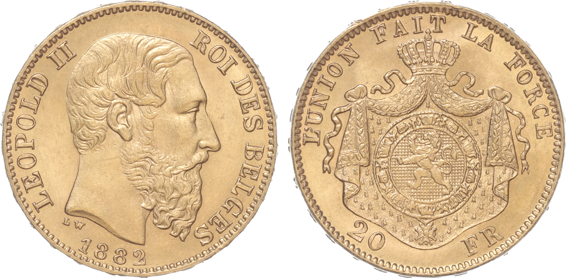 Belgium. 20 Francs gold 1882. UNC.