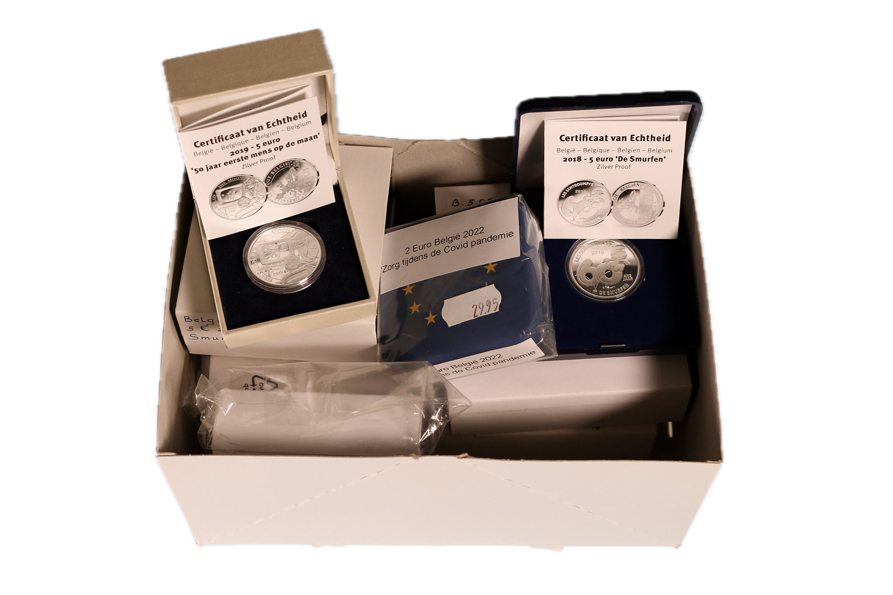Belgium. 2 Euro 2022 Covid. Proof in box; 5 euro 2008/2020(8). Total 9 pcs.