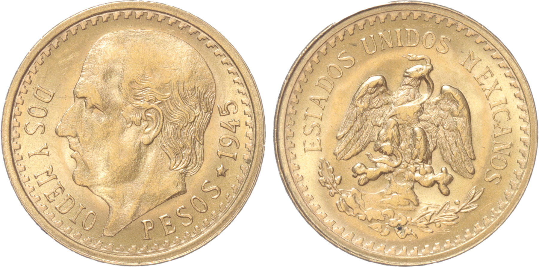 Mexico. 2 1/2 Pesos gold 1945. UNC.