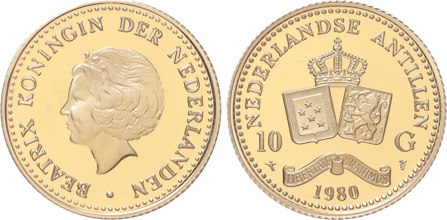 Nederlandse Antillen. 10 Gulden goud 1980. Prooflike in cassette.