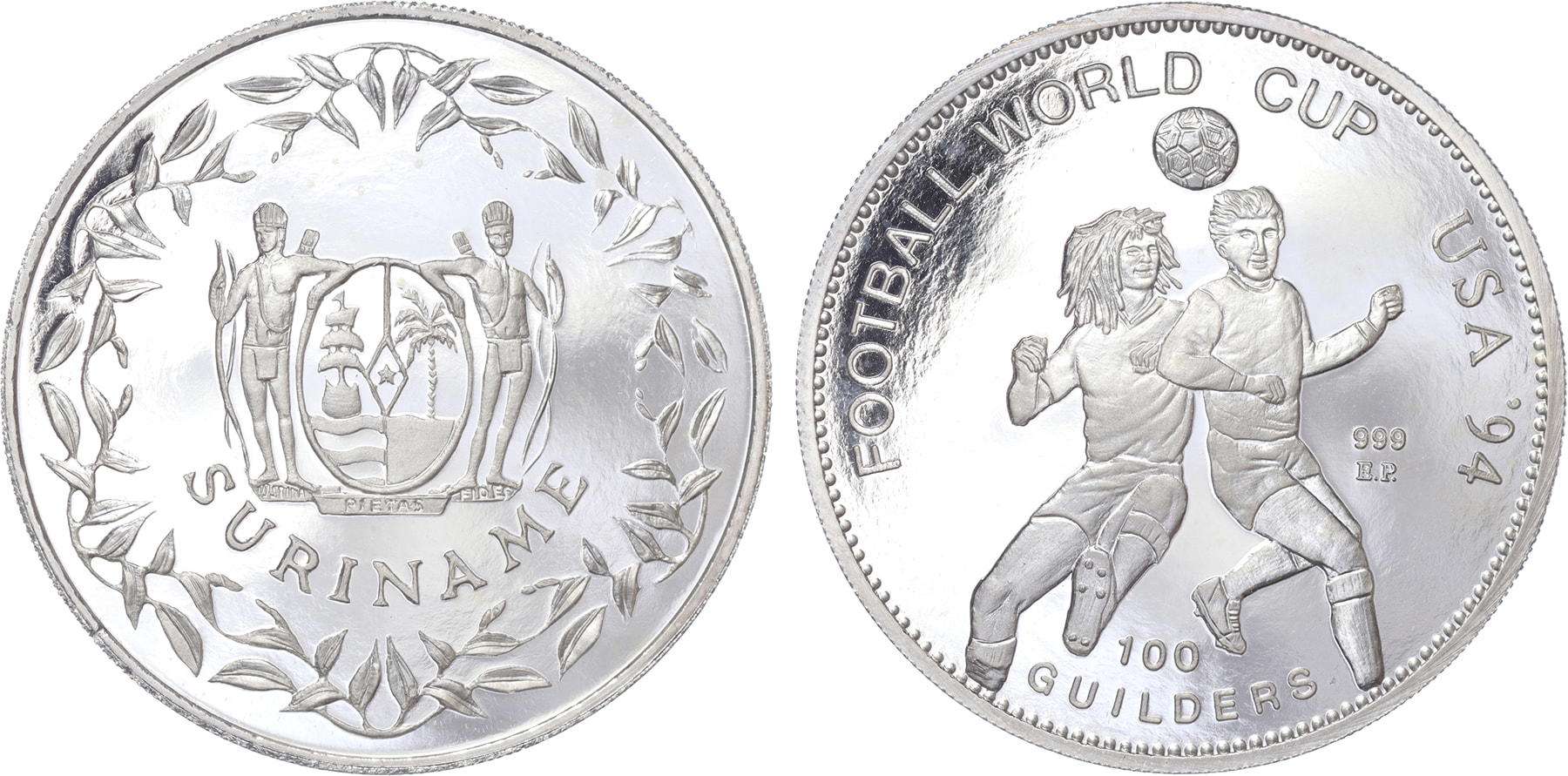 Suriname. 100 Gulden nikkel 1994. WK-voetbal USA. 999 rechts. Proof.