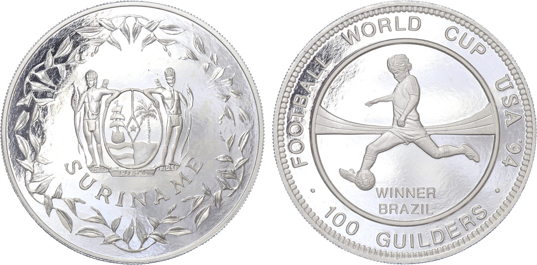 Suriname. 100 Gulden nikkel 1994. WK-voetbal USA. Winner Brazil. Proof.