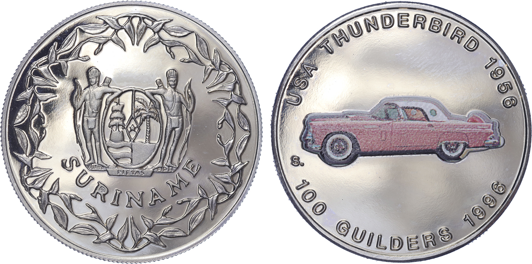 Suriname. 100 Gulden nikkel 1996. USA Thunderbird 1956. Proof.