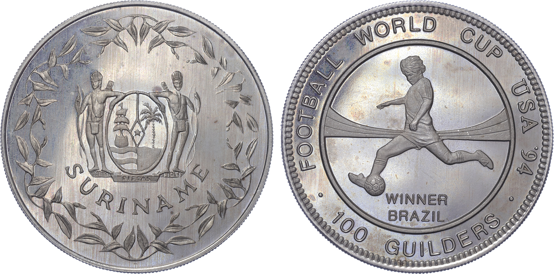 Suriname. 100 Gulden zilver 1994. WK-voetbal USA. Winner Brazil. Proof.