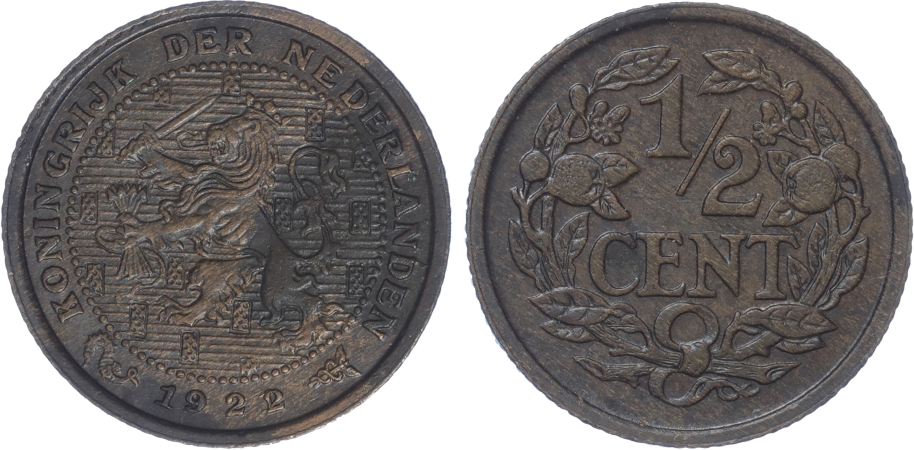 1/2 Cent 1922 over 1921. Mooie duidelijke jaartalwijziging. Prachtig.
