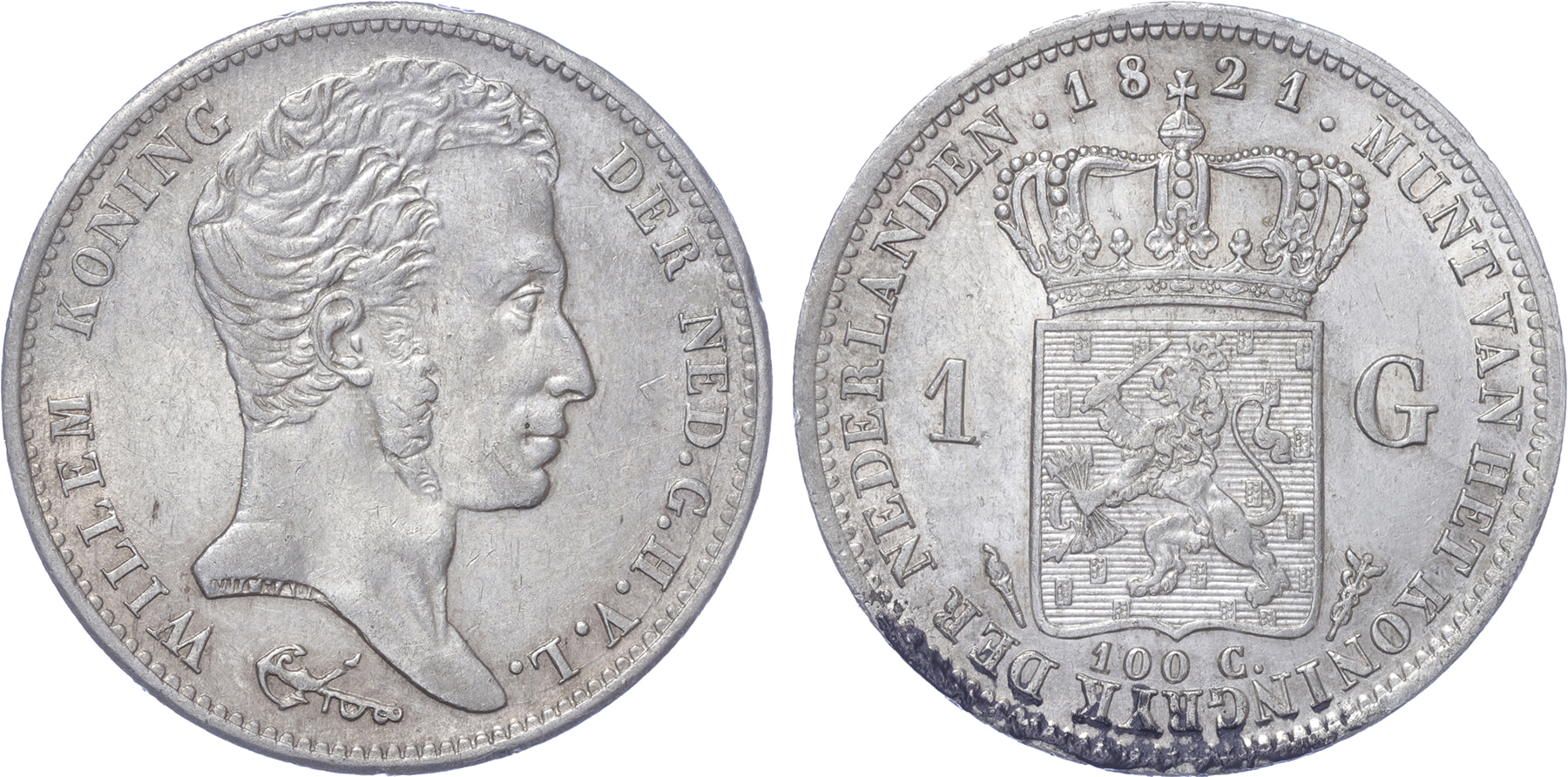 1 Gulden 1821 Utrecht. Iets corrosie in de rand, overigens prachtig.