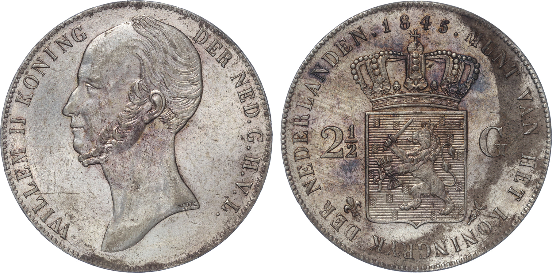 2 1/2 Gulden 1845a. Prachtig+. Enkele zwarte vlekjes.