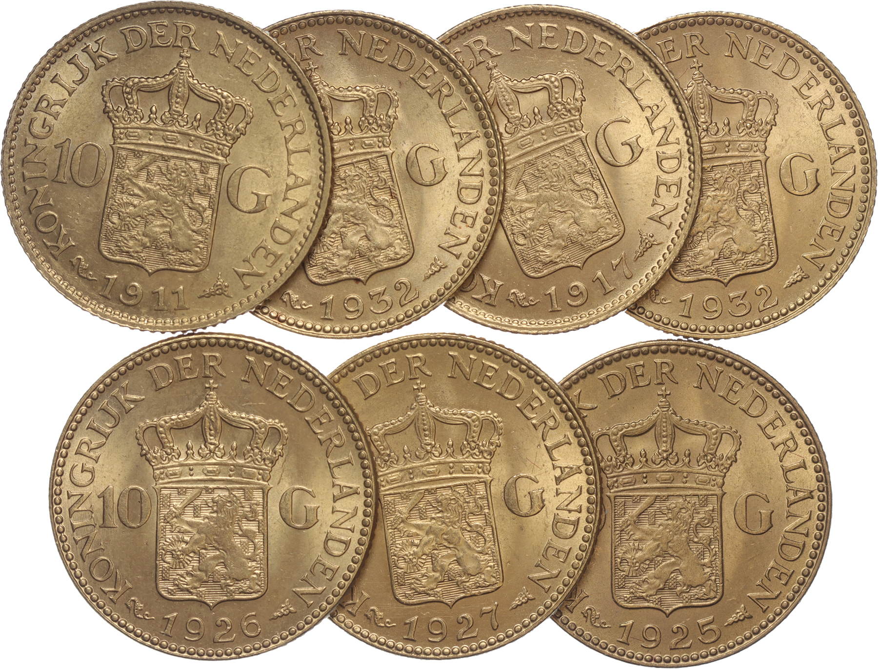 10 Gulden goud 1911, 17, 25, 26, 27, 32(2). 7 ex.