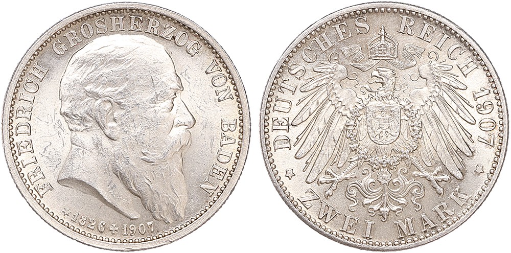 Baden. 2 Mark 1907. Death of Friedrich. KM 278. UNC.