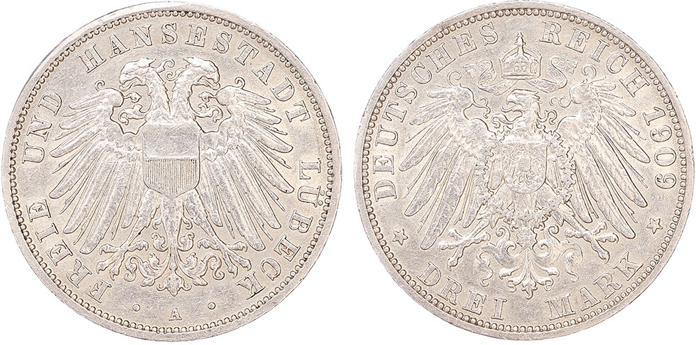 Lubeck. 3 Mark 1909A. KM 215. XF.