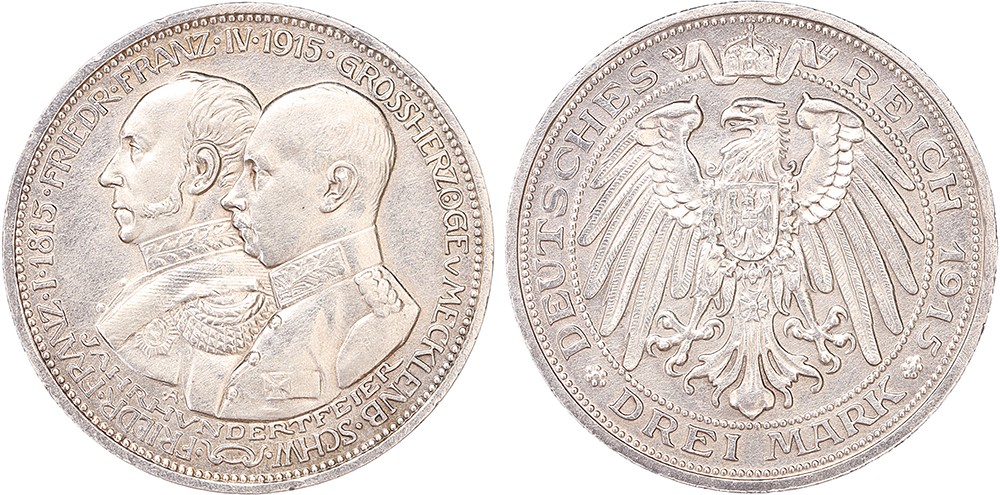 Mecklenburg-Schwerin. 3 Mark 1915A. KM 340. XF.