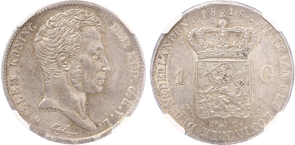 1 Gulden 1818 Utrecht. UNC-. NGC AU 55. Eerste gulden van het Koninkrijk onder Koning Willem I. Uiterst zeldzaam.