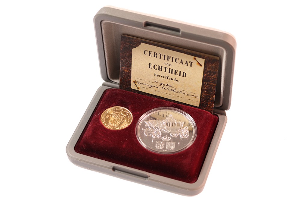10 Gulden goud 1917 + zilveren penning in cassette KNM.