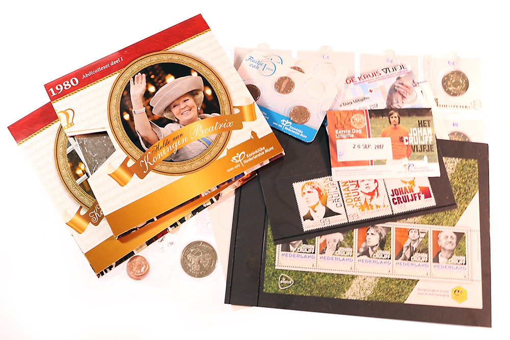 Doosje muntsets, coincards w.o. Cruijff 1e dag en enkele postzegels.
