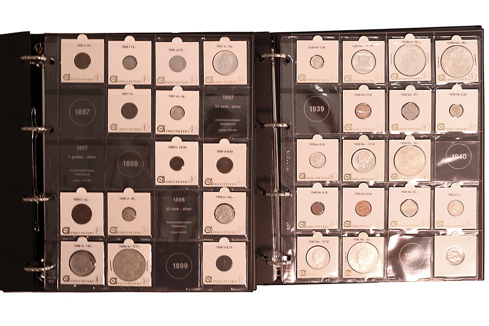 Wilhelmina. Verzameling op jaartal in 2 albums. O.a. 1 gulden 1910/1917; 2 1/2 gulden 1898, 1932 en 1938 grof haar.