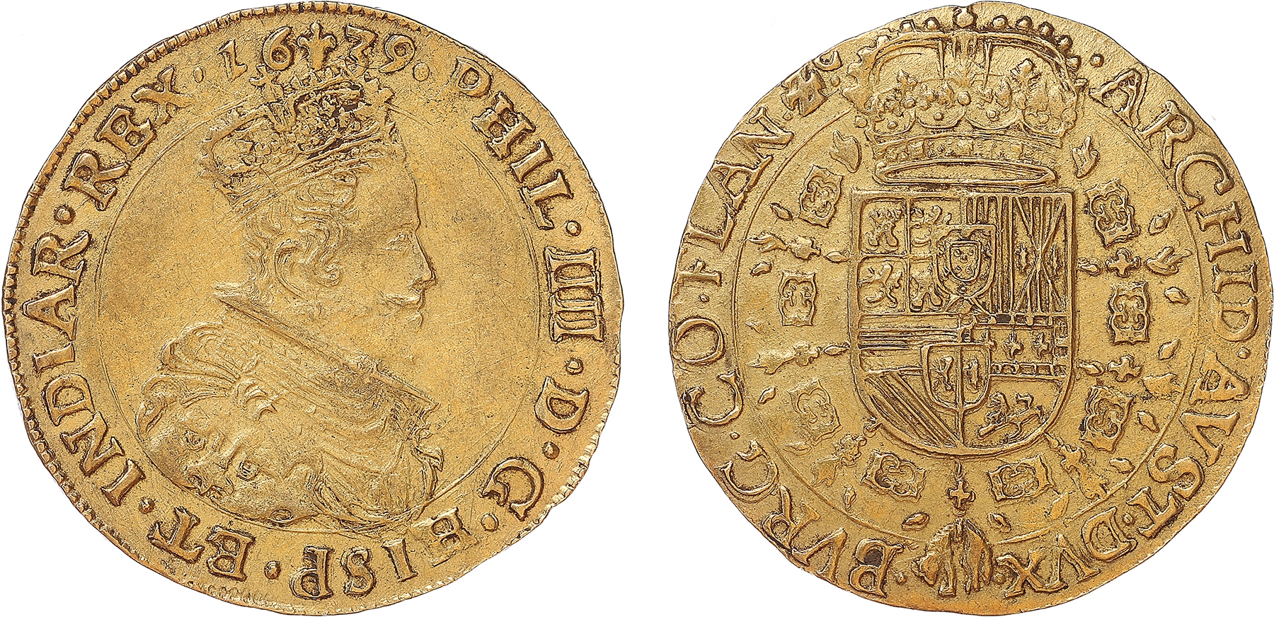 Netherlands. Spaanse Nederlanden. Vlaanderen Filips IV. Dubbele souverain d'or. 1639. Brugge. Borstbeeld naar rechts. kz. gekroond wapen. Delm. 559; Fr. 226 (143a); Vanhoudt 637.BG. Zeer fraai/prachtig.