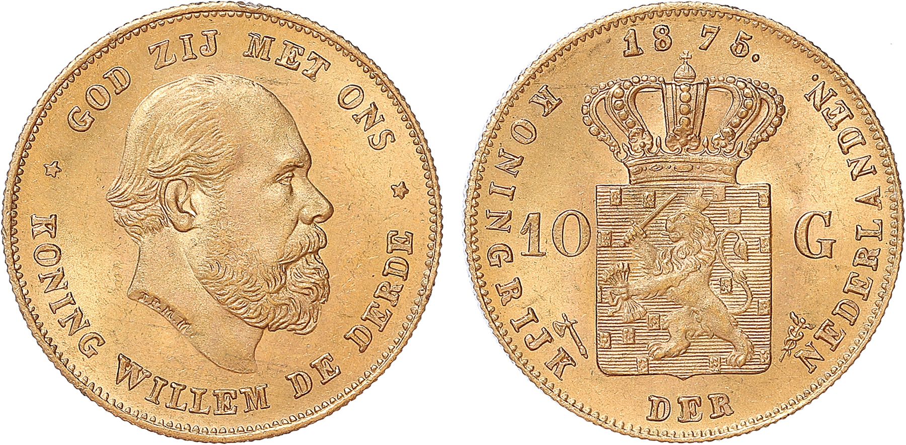 Netherlands. 10 Gulden goud 1875. Prachtig.