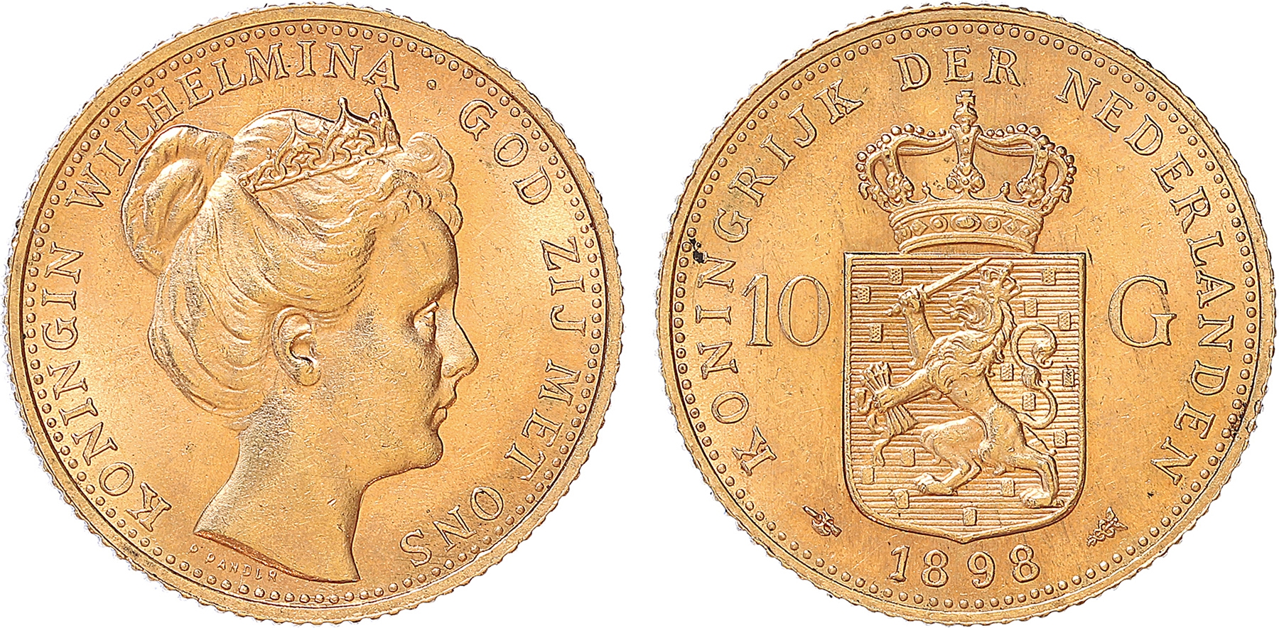 Netherlands. 10 Gulden goud 1898b. Zonder punt tussen P en Pander. Prachtig+.