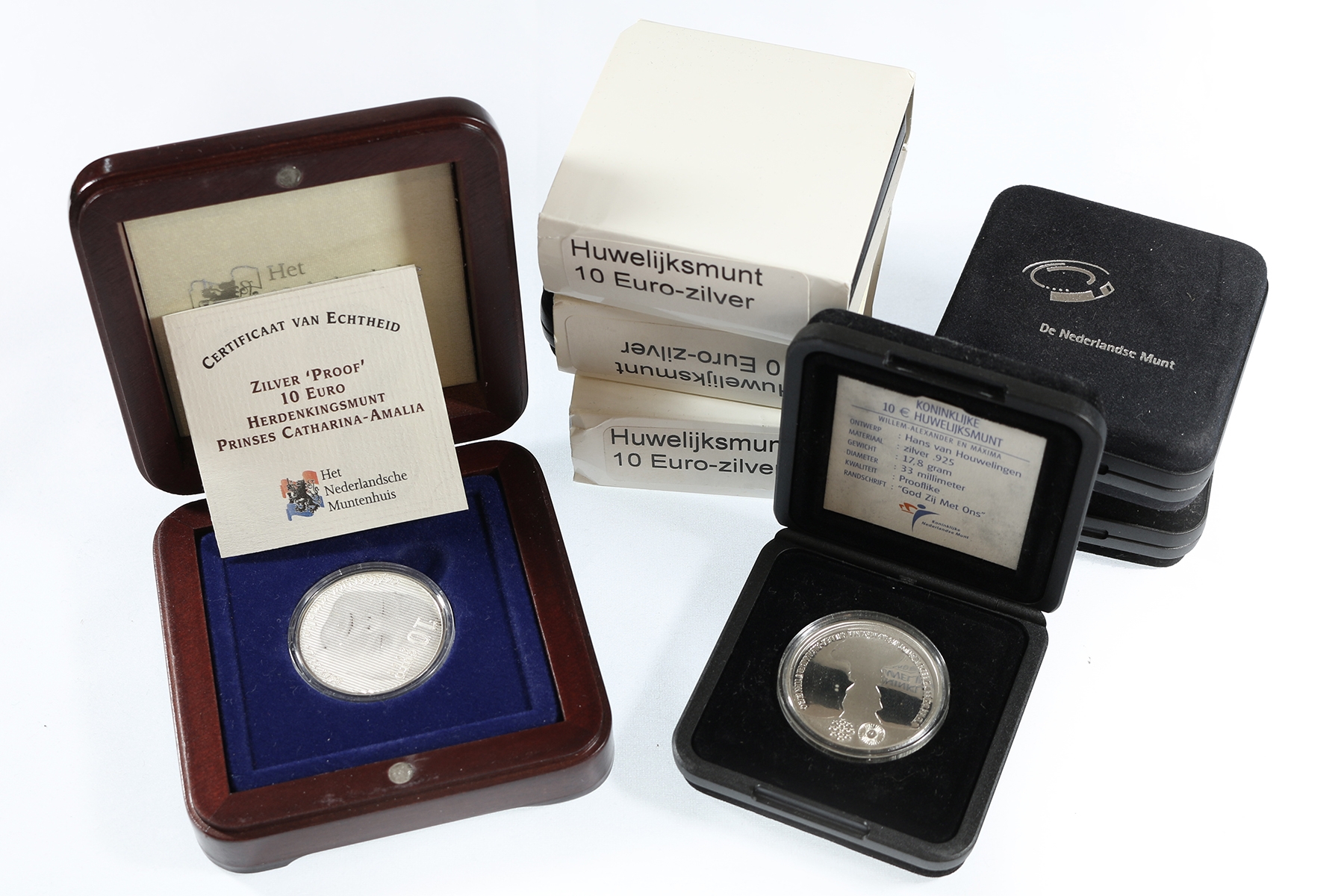 Herdenkingsmunten. 10 Euro zilver 2002 Huwelijk proof in cassette(6) en 10 euro 2004 Amalia proof. 7 ex.