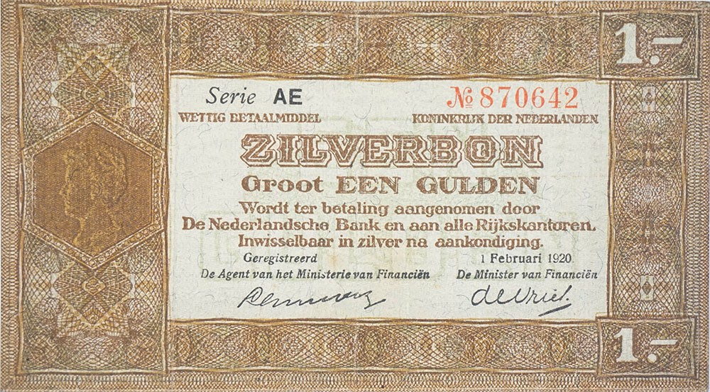 1 Gulden zilverbon 1920. Alm. 03-1a. Ca. zeer fraai.