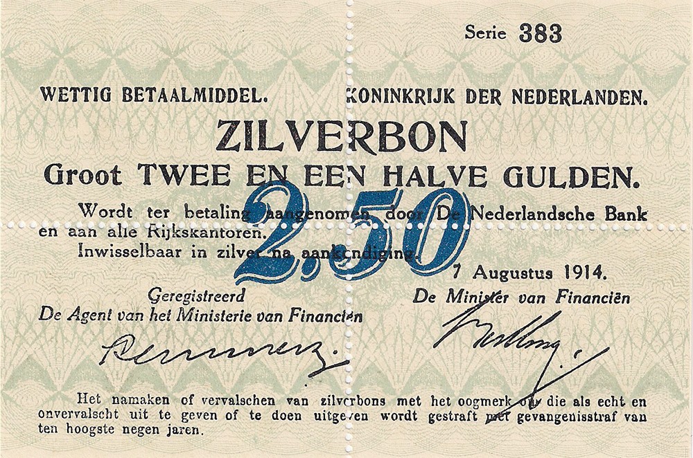 2 1/2 Gulden zilverbon 1914. Geperforeerd. UNC.