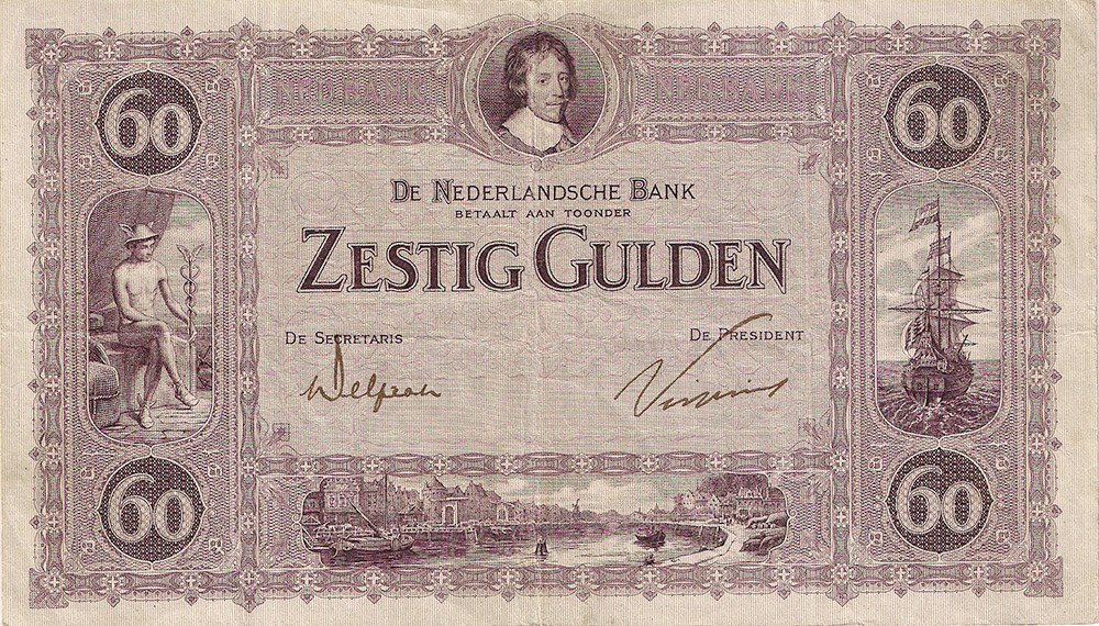 60 Gulden 1921 bankbiljet. 7 april 1923. Delprat/vissering. Alm. 108-1b. Aantrekkelijke zeer fraai.