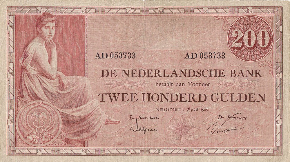 200 Gulden 1921 bankbiljet. 8 april 1926. Alm. 133-3a. Ca. zeer fraai.