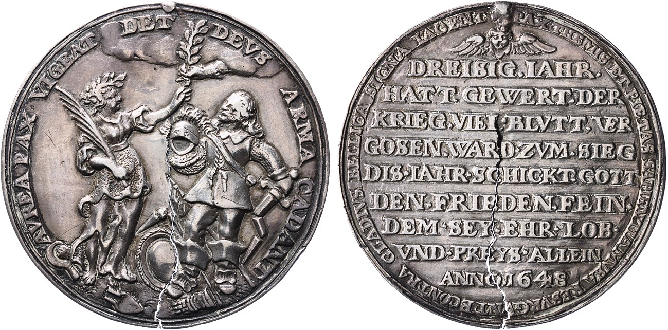 Germany. Medal 1648. Peace of Westphalia. Silver 54mm, 20,38 g. Fine details. Damaged.