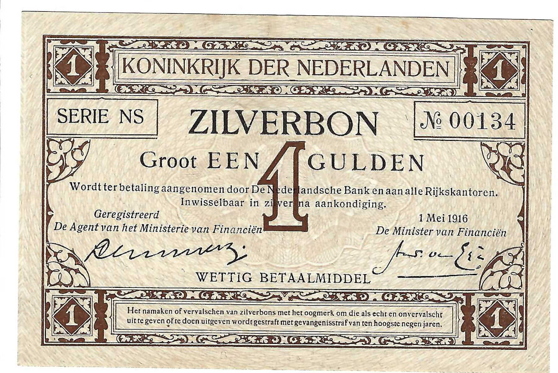 1 Gulden 1916 zilverbon. Alm. 02-1b. Prachtig-.