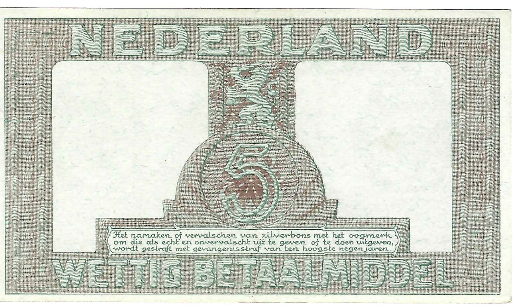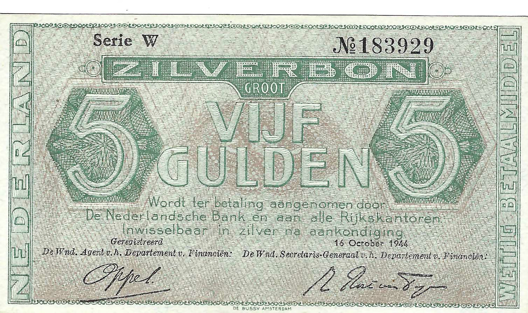 5 Gulden 1944 zilverbon. Alm. 22-1a. Prachtig.