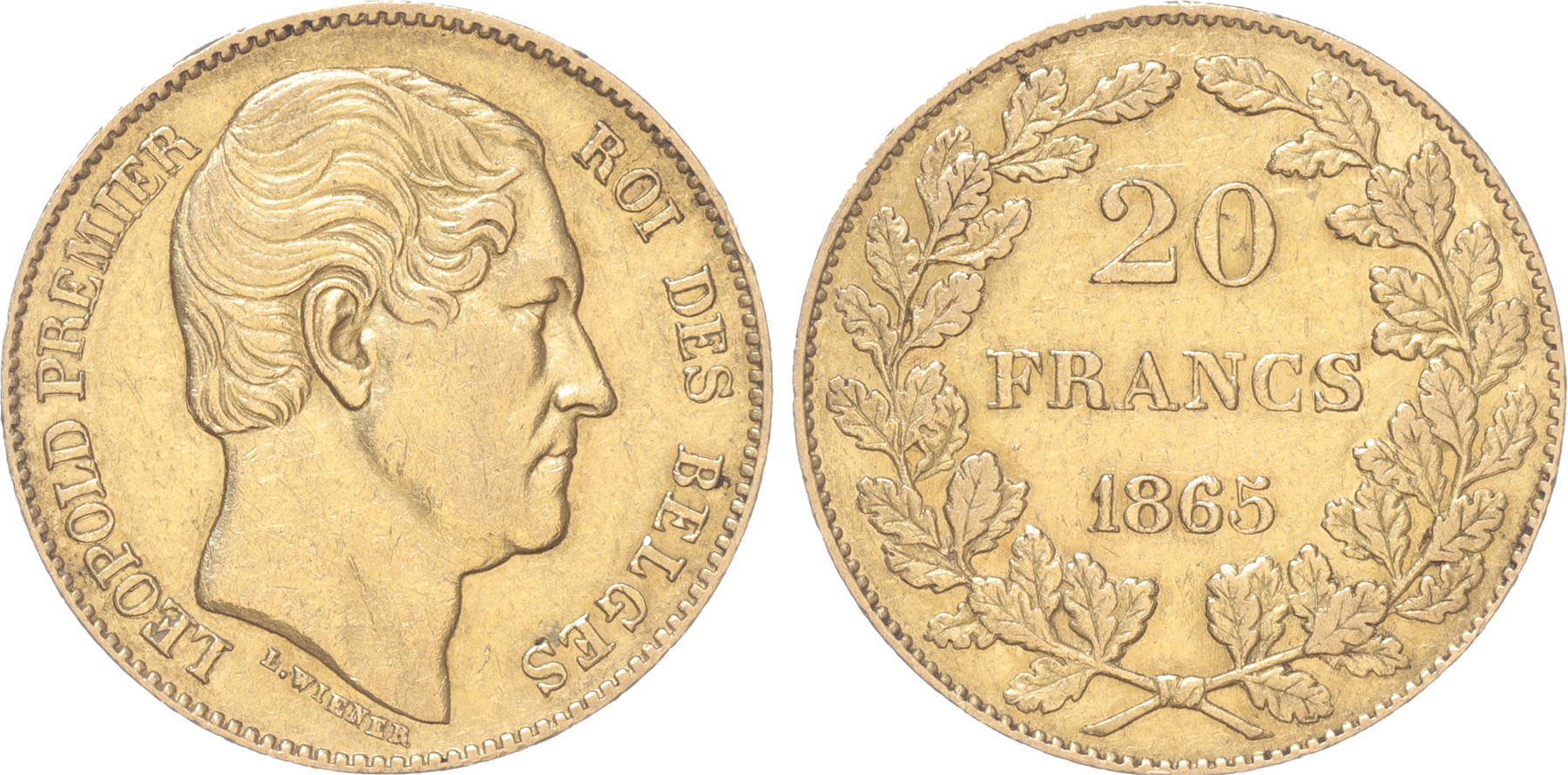 Belgium. 20 Francs gold 1865 pos. a. VF.
