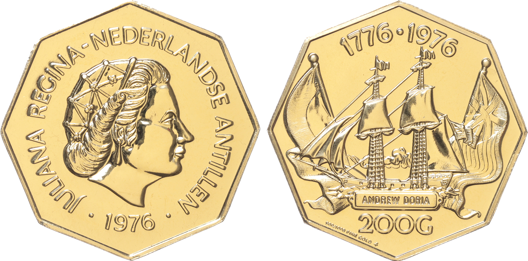 Nederlandse Antillen. 200 Gulden goud 1976. Andrew Doria. BU.