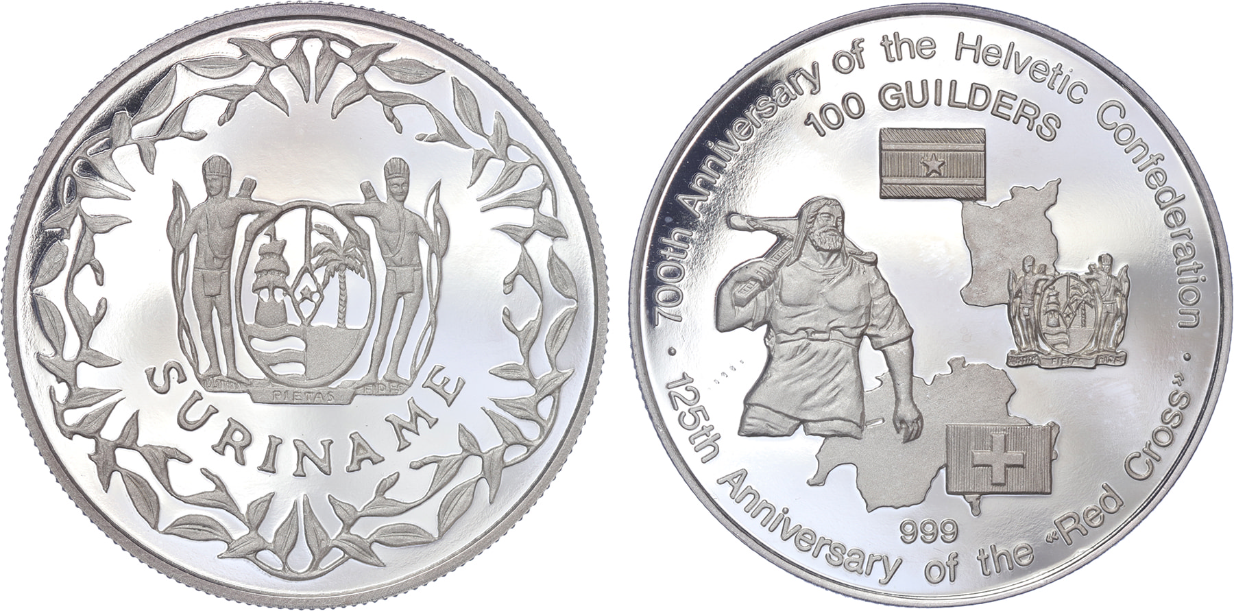 Suriname. 100 Gulden zilver (1991). Rode Kruis. Proof.