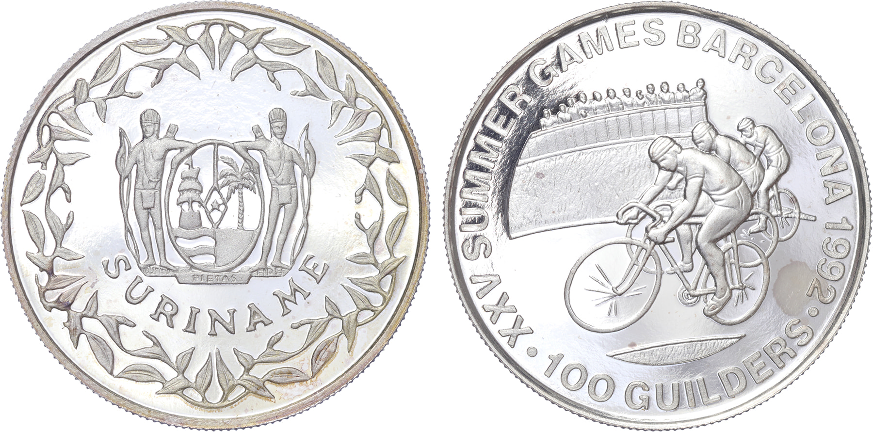 Suriname. 100 Gulden zilver 1992. Wielrennen. Medailleslag. Proof.
