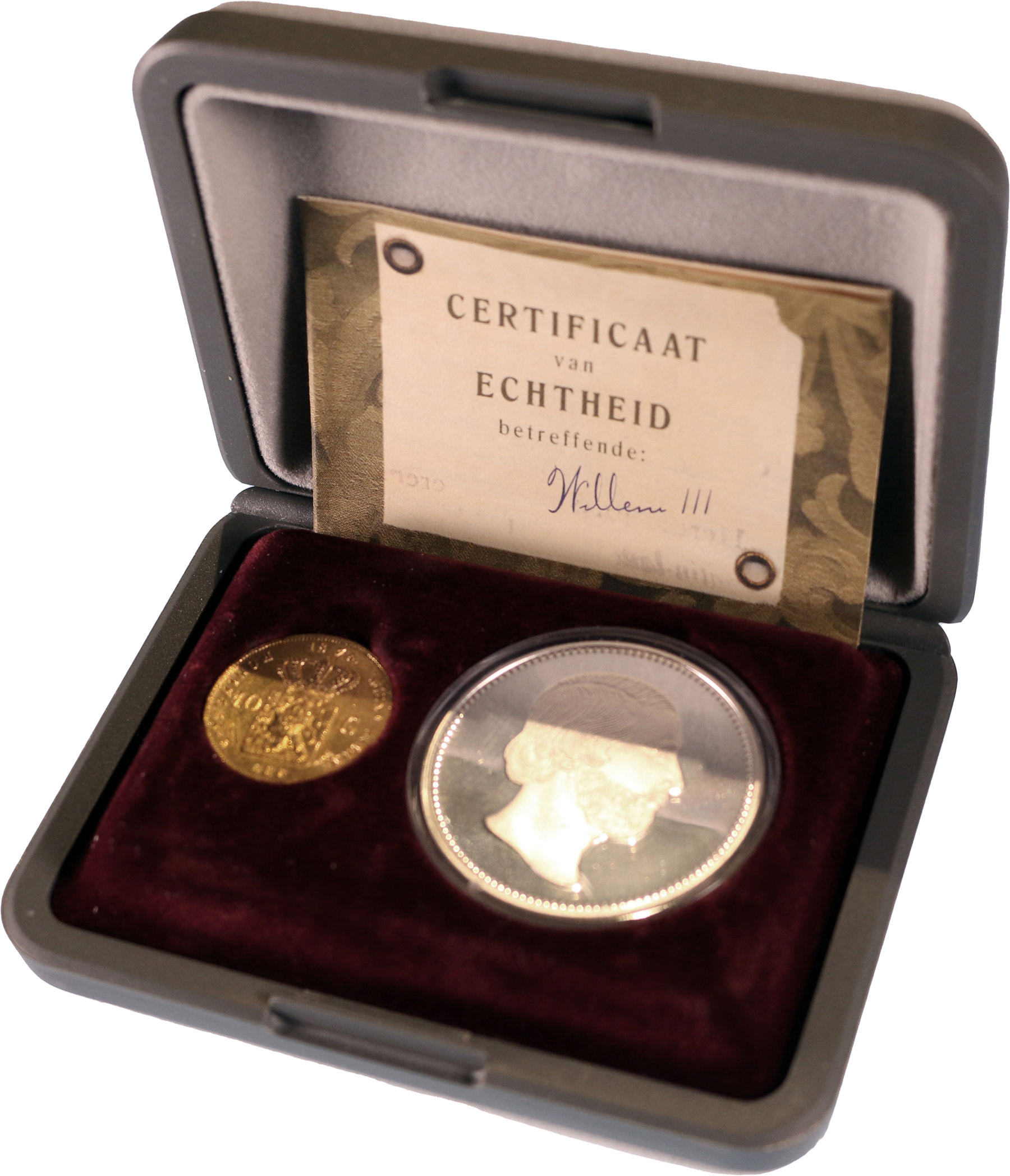 10 Gulden goud 1875 + zilveren penning in cassette.