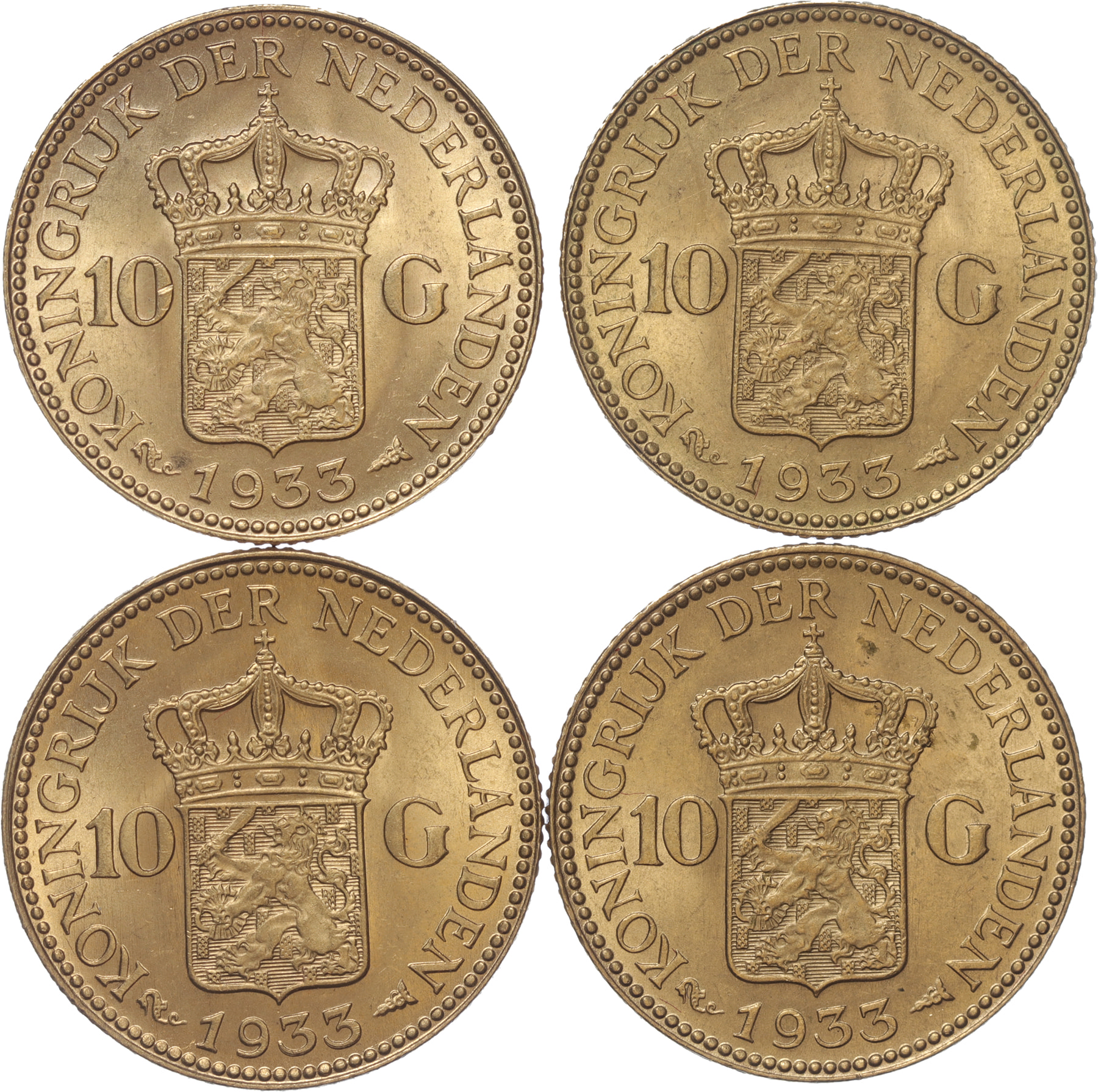 10 Gulden goud 1933. Prachtig/FDC. 4 ex.
