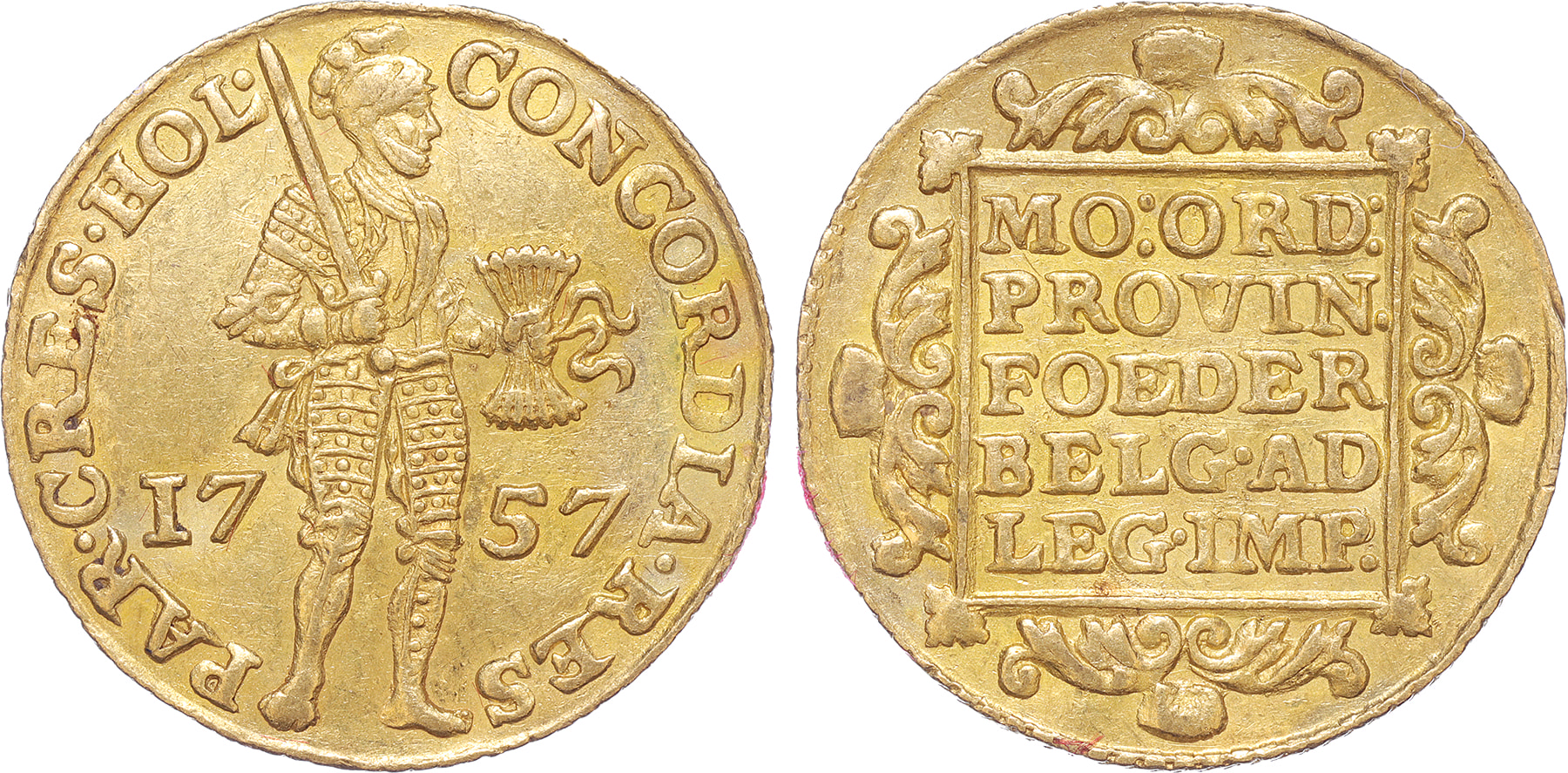 Holland. Gouden dukaat 1757. Cnm. 2.28.54; D. 775. Zeer fraai+.