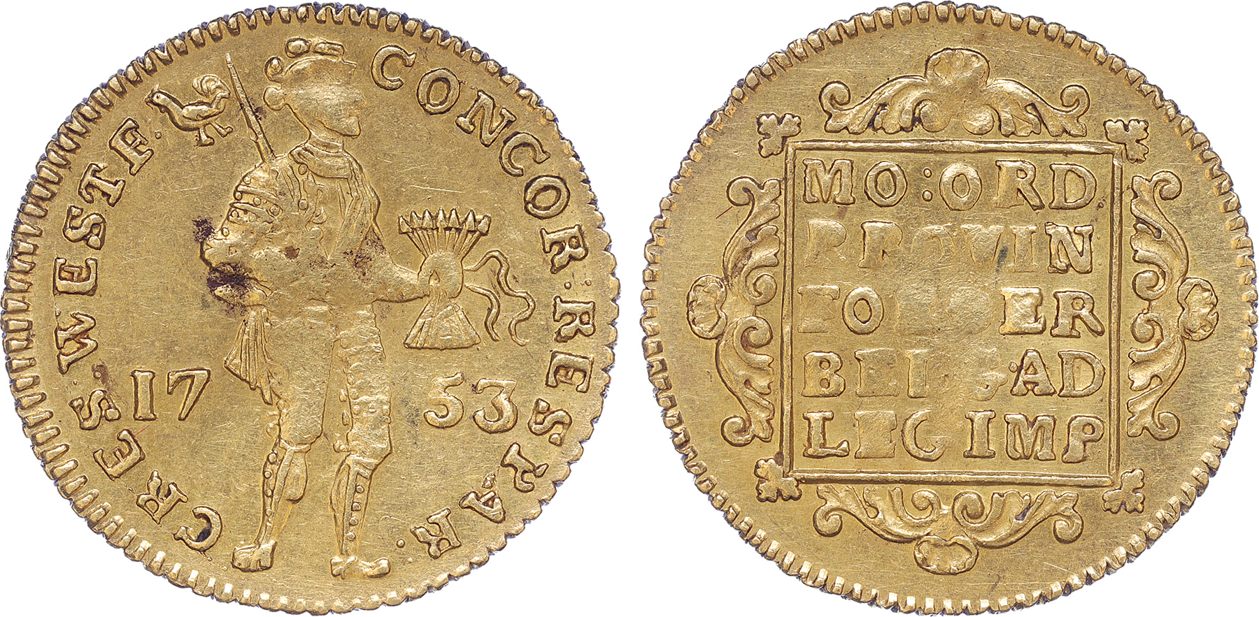 West-friesland. Gouden dukaat 1753. Cnm. 2.46.16; D. 838. Zeer fraai.