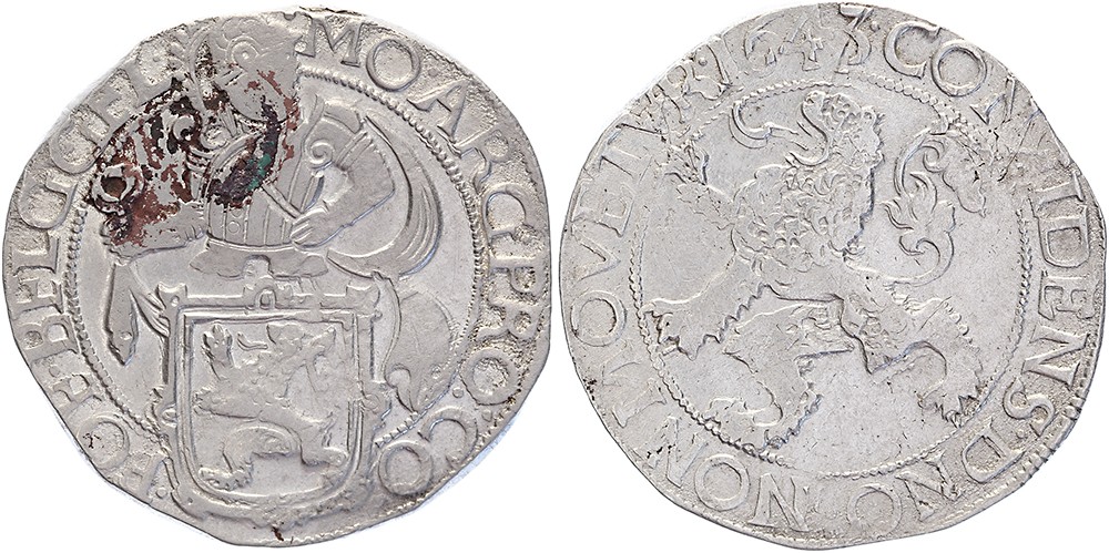 Leeuwendaalder 1643. Delm. 825; CNM 2.17.107; HPM 56. Vondstexemplaar. Zeer fraai.