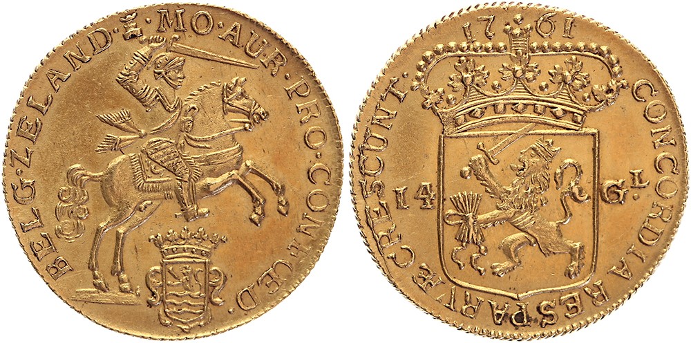 Rijder of 14 gulden 1761. Delm. 889; CNM 2.49.21; HPM 24 [9,99 gram]. Prachtig.