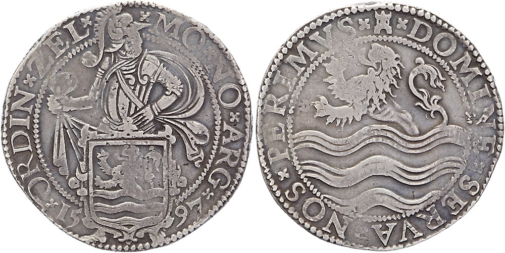 Leeuwendaalder 1597 op Zeeuwse voet. Delm. 838; CNM 2.49.39; HPM 28. Vrijwel zeer fraai.
