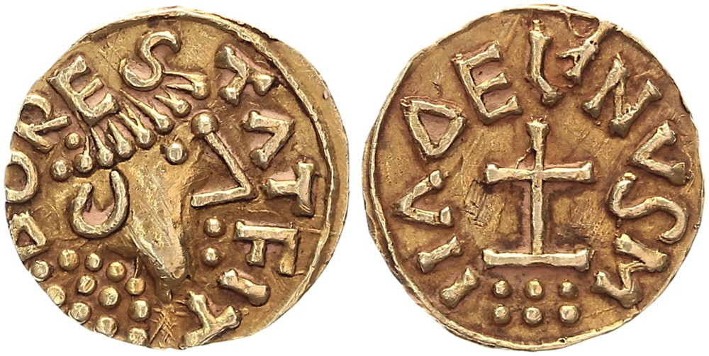 Gouden triens z.j. (ca. 625-650). Gekroond hoofd naar rechts, DORESTATE FIT / Kruis boven zes bolletjes in twee rijen van drie, MADELINVSvdCh. VIII-4; Delm. 17; MEC 494 var. [1,23 gram]. Schaars. Vrijwel prachtig.