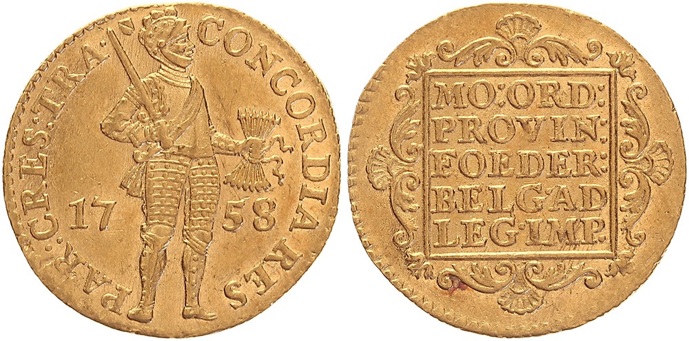 Dukaat 1758. Delm. 965; CNM 2.43.46; HPM 27 [3,48 gram]. Klemsporen. Prachtig.